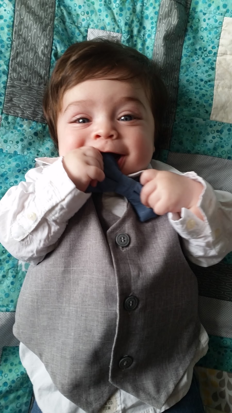 Since you have mastered rolling to your stomach, you love spending lots of time there. You can push yourself all the way up.You can also turn yourself in a full circle and scoot yourself forward and backwards a small distance. To go forward you pull your legs under you, put your butt in the air, and then push forward. When you go backwards, you push your arms straight up and push back. You can also straighten your legs when you push your butt up. You seem to be making small steps towards crawling. You have also been enjoying sitting up, and you can balance that way for a few seconds. You love when mama and papa pull you up to sitting.